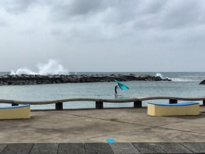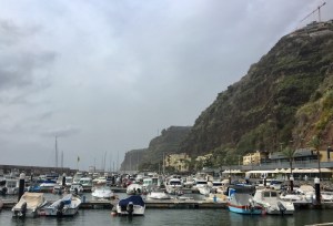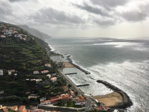 Calheta ist als Badeort und für die vielfältigen Wassersportarten bekannt. Bei unserem Besuch im Januar ist davon natürlich nicht viel zu sehen. Die Schiffe in der Marina dümpeln so vor sich hin. Ein einsamer Surfer versucht, den Sturmböen zu trotzen. Wasser und Luft haben beide ähnliche Temperaturen um 20 Grad herum, also baden auch (wenige) Menschen.