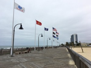 Wir gehen von dort aus direkt zum Strand und gehen auf dem Broadwalk entlang Richtung Süden. Auf diesem knapp zwei Kilometer langen Abschnitt befindet sich die Amüsiermeile von Myrtle Beach, viel los ist hier natürlich noch nicht. Zuerst geht es an vielen Restaurants vorbei, hier besteht der Weg aus mosaikartig verlegten Holzbohlen.
