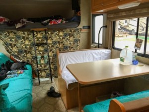 Als wir ziemlich nass vom Regen sind, geht es zurück zum Aufwärmen in unser motorhome. Die Heizung funktioniert sehr gut. Mit der übrigen Bettwäsche (wir haben unsere eigene mit, aber auch die des Verleihers) haben wir inzwischen das Interieur etwas aufgehübscht. Morgen geht es wieder on the road, weiter nach Süden, der Sonne entgegen.