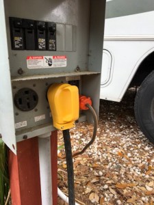 Am nächsten Tag hält der Schrecken an. Bei Tageslicht geht es zunächst etwas besser los. Kay schließt das 12 V-Kabel an, mit dem betreiben wir den Wasserkocher für Kaffee. Dann ruft er den mobilen RV-repair an, da geht nur der Anrufbeantworter an und er ruft bis mittags nicht zurück. Der andere Typ, dessen Nummer wir bekommen, ist drei Wochen lang ausgebucht. Die Leute vom Campingplatz sind hilfsbereit, messen alles durch, der Fehler liegt bei uns und sie finden, dass unser Stecker kaputt ist.