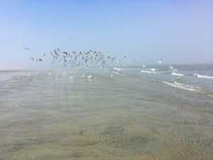 Wir sind die dänische Nordsee gewohnt, für uns sieht das Meer extrem einladend aus. Und im Gegensatz zur Nordsee ist das Wasser hier sehr warm. Schwimmen kann man nicht, dazu es es viel zu flach. Aber sich von den Wellen treiben lassen, ist klasse.