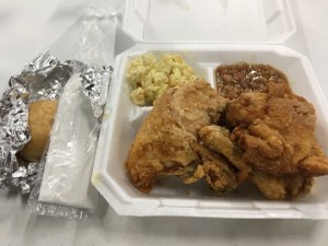Heute gibt es ein halbes Huhn, deep-fried mit leckerer Kruste, sehr guter Kartoffelsalat und pikante heiße Bohnen, dazu noch ein Hefebrötchen mit Butter, wenn gewünscht und eine Flasche eiskaltes Wasser, und das alles für 13$ pro Person. Für dieses Preis-Leistungs-Verhältnis können wir den military-Kram gut für anderthalb Stunden ignorieren.
