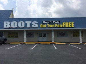 Kurz vor dem Tagesziel fahren wir von der Interstate 75 ab und besuchen das Boot Factory Outlet. Bereits auf der Hinfahrt nach Ocala sahen wir die großen Billboards mit dem Werbespruch „Buy one, get two pair free“ (Man zahlt bei drei Paar Stiefeln nur den Preis des teuersten Paars.).